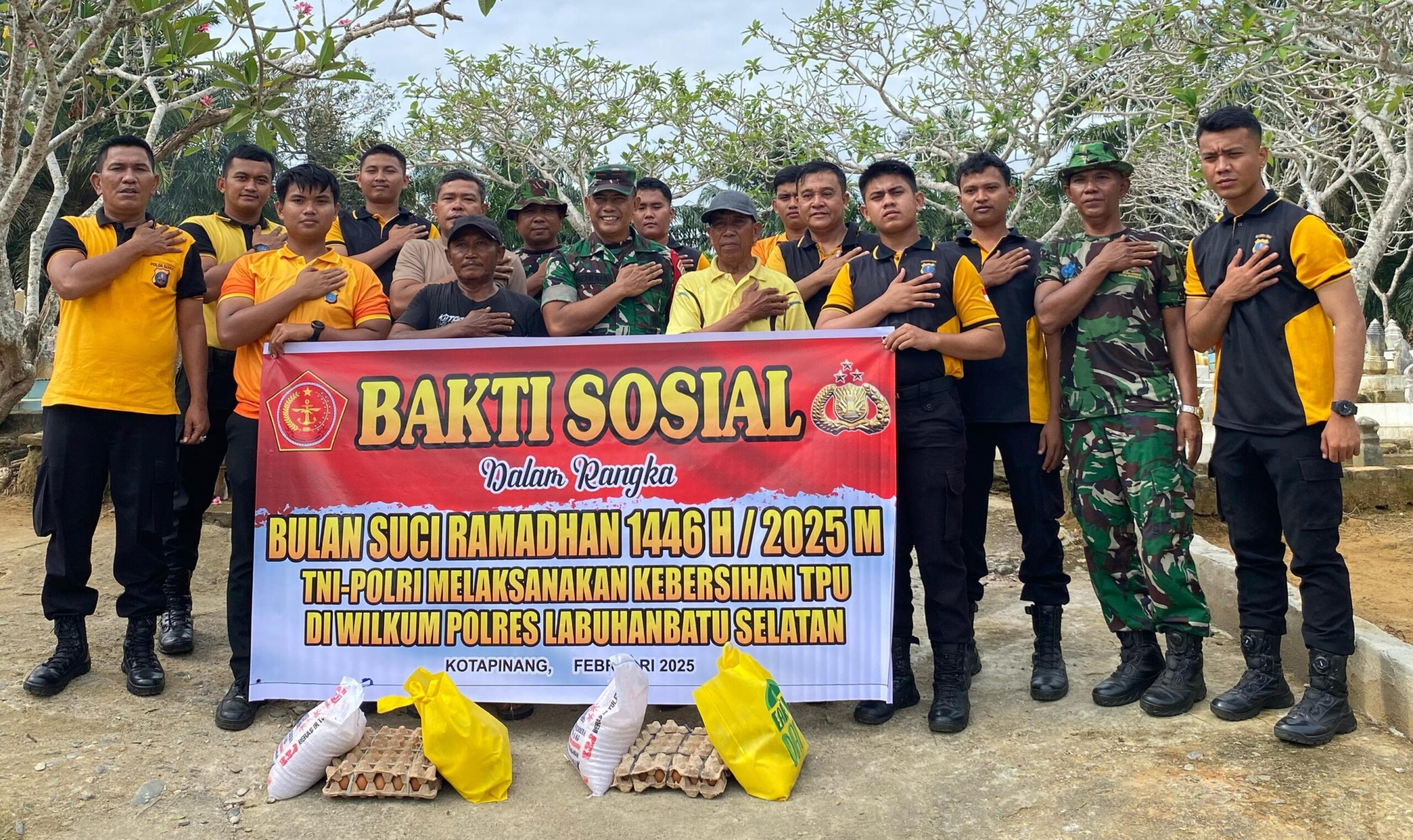 Katapublik Labusel, Dalam rangka menyambut bulan suci Ramadhan 1446 H/2025 M, Polres Labuhanbatu Selatan bersama Koramil 11/Kotapinang menggelar kegiatan Bakti Sosial (Baksos) dengan membersihkan Tempat Pemakaman Umum (TPU) Suka Mulia di Lingkungan Simaninggir, Kelurahan Kotapinang, Kecamatan Kotapinang, Kabupaten Labuhanbatu Selatan, Selasa (25/2/2025).