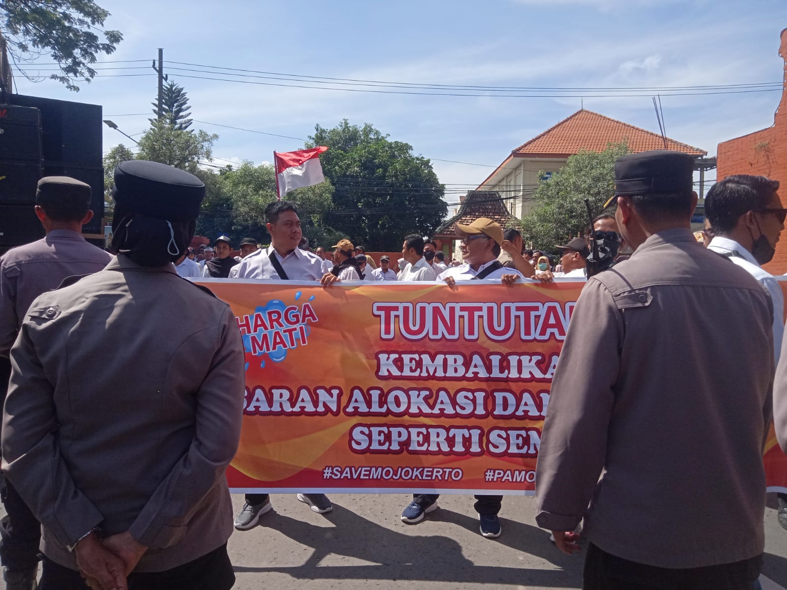 Mereka turun ke jalan menuntut agar pemerintah Kabupaten Mojokerto tidak memangkas Alokasi Dana Desa (ADD) 2026 yang akan menjadi sumber pendapatan utama bagi desa-desa di Mojokerto,