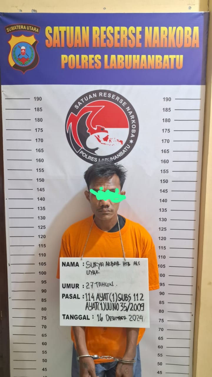 KATAPUBLIKJATIM|Labuhanbatu, – Tim Opsnal Satuan Reserse Narkoba Polres Labuhanbatu berhasil menangkap seorang pria yang diduga sebagai pengedar narkotika jenis sabu di Jalan Sirandorung Ujung, Kelurahan Sirandorung, Kecamatan Rantau Utara, Kabupaten Labuhanbatu, pada Senin (16/12/2024) sekitar pukul 18.30 WIB. Penangkapan ini dipimpin oleh IPTU Ropensus Manik.