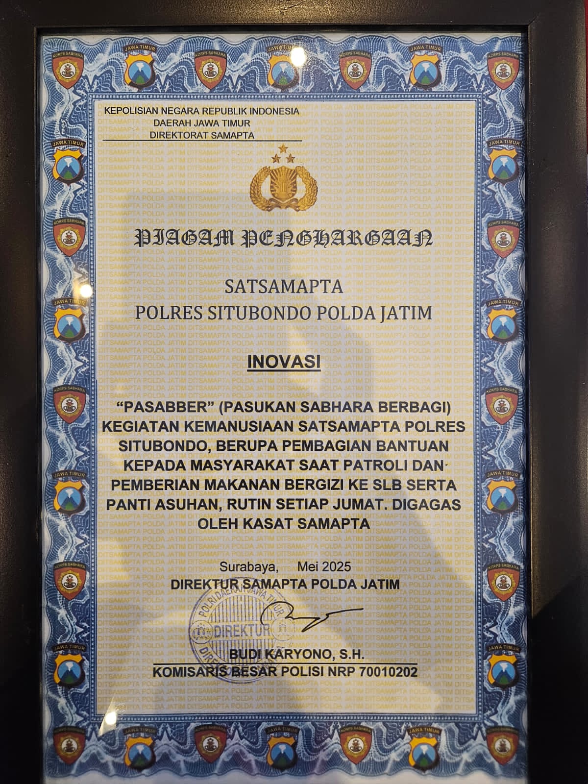 Situbondo, Katapublikjatim – Satuan Samapta Polres Situbondo kembali menorehkan prestasi membanggakan di tingkat Polda. Inovasi sosial PASABBER (Pasukan Samapta Berbagi) dan PADI BERKAH (Patroli Dialogis Sambil Bersedekah) yang diinisiasi dalam bentuk kegiatan pemberian bantuan kepada masyarakat saat patroli dan penyaluran makanan bergizi ke SLB serta panti asuhan, mendapatkan penghargaan khusus dari Dirsamapta Polda Jawa Timur.
