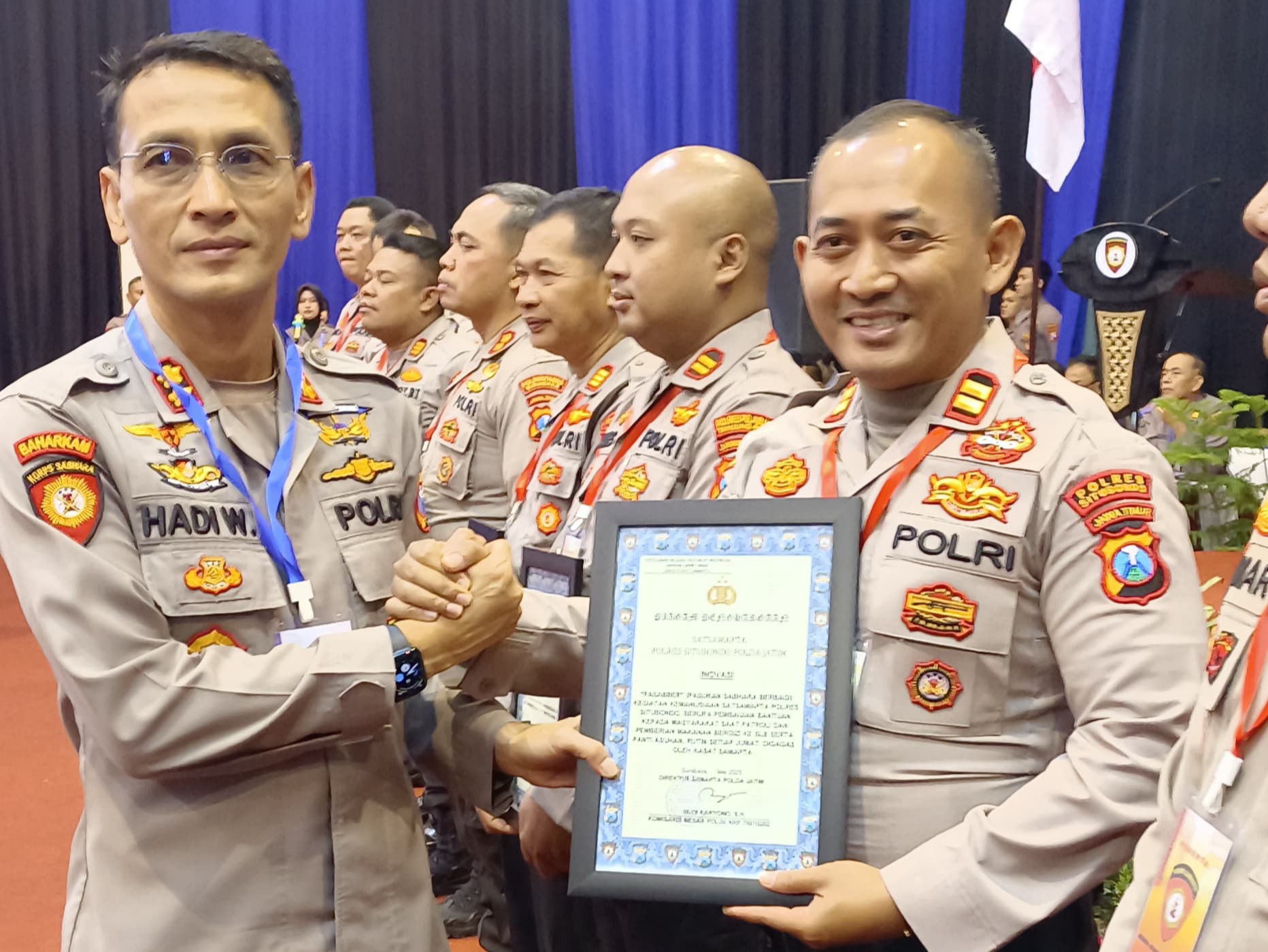 Penghargaan tersebut diserahkan langsung oleh Dirsamapta Polda Jatim Kombes Pol Budi Karyono, S.H. kepada perwakilan Satsamapta Polres Situbondo dalam kegiatan Rakernis Fungsi Samapta Polda Jatim Tahun Anggaran 2025 yang digelar di Hotel Batu, Kota Batu.